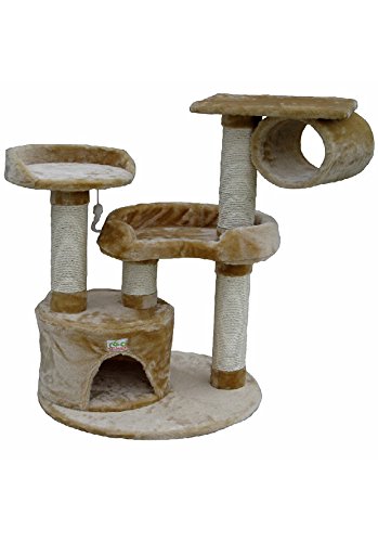 Overall size; 33-inch width by 24-inch length by 39-1/2-inch height. Base board size; 24-inch dia. Size of condo; 13-inch dia by 12-inch height. Size of top bed; 13-inch dia by 3-1/2-inch height. Size of bed; 17-inch length by 12-inch length by 4-inch height. Number of hanging toy; 1 number of posts; 5 number of levels; 6 posts covered by natural sisal rope covering material.