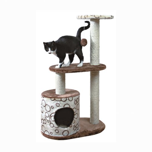 The Trixie Casta Cat Tree will provide endless opportunities for cats to play, explore, scratch or just relax. Felines can sharpen their claws on any of the three scratching posts instead of on your furniture or carpet, giving them a healthy outlet for their scratching instincts. All posts are covered in durable sisal. For a nap or a cozy retreat, the cat can crawl inside the cat condo base. Spunky cats can jump, climb or perch atop one of the platforms and lie in wait for unsuspecting prey or simply enjoy the view. We’ve also included a dangling plush toy and rope for added fun. One year warranty. Color: brown and beige. Dimensions (Inch): 22 x 14 x 37; posts 3. Weight: 18 pounds.