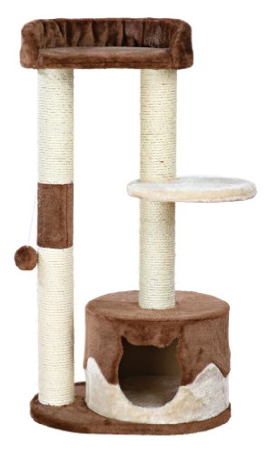 The Trixie Pillar Cat Tree will provide endless opportunities for cats to play, explore, scratch or just relax. Felines can sharpen their claws on the scratching posts instead of on your furniture or carpet, giving them a healthy outlet for their scratching instincts. All posts are covered in durable sisal and brown plush for added style. If a nap or place to hide is in order, the cat can crawl inside the kitty condo lined with plush and fleece, making it the perfect retreat. Feeling a little spunky? Jump, climb or perch atop one of the plush covered platforms and lie in wait for unsuspecting prey or simply enjoy the view. The top platform has extra padding and a backrest for added comfort. We’ve even included a dangling pom-pom for extra fun. The subtle earth tones of the sisal and plush fabric also make this piece of cat furniture easy to integrate into your home decor. Suitable for cats of all ages and activity levels. One year warranty. Color: brown and beige. Dimensions (Inch): 20 x 15 x 39; condo 14 x 14 x 10; posts 3.5; platform 12 x 12; top platform 15 x 13 x 4. Weight: 23 lbs.