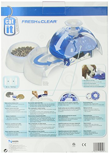 The Catit Design Fresh & Clear Drinking Fountain with Food Bowl responds to your pet’s need for a continuous supply of fresh and clean drinking water. Re-circulating water with greater exposure to oxygen provides fresh-tasting, cool filtered water for pets with a multitude of health benefits. Multi-surface drinking areas allow your pet to drink from the bowl or directly from the dome. The unit’s greater water capacity, 100 fluid ounces, ensures that continuous fresh water is always available, and eliminates the need for daily refilling. Its safe, low-voltage system (12 Volts) is energy-efficient, consuming less than 4 watts (less power than a night light). Suitable for multiple pets, the Catit Design Fresh & Clear Drinking Fountain with Food Bowl is also suitable for puppies and small dogs. The Catit Design Fresh & Clear Drinking Fountain with Food Bowl is easy to clean and maintain, and is ideal for any living space. It also includes a food dish as free bonus. Replacement purifying filters and matching place mat sold are separately.