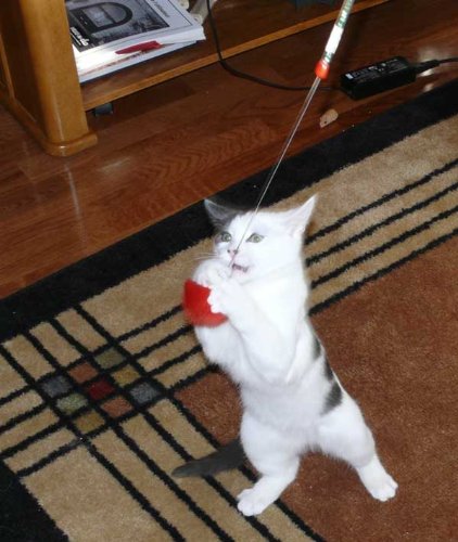 This wand-style cat toy features a fun fur ball that will attract your cats and kittens and get them to play. Simply hold the wand in your hand and wiggle the fur ball in front of your cat to entice her. The fur ball has a bouncy action that will get your feline friends jumping and having all sorts of fun! Helps inactive cats get the exercise they need while giving you quality interactive play time with your cat. Toys made with assorted colors/materials. Handcrafted in the U.S.A.