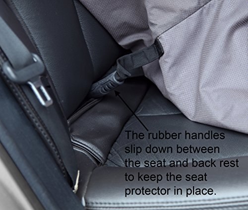The Durable Pet Seat Protector is an incredible value – the uncompromising strength, toughness and durability of the 1200 Denier polyester fabric makes this a great value! The Seat Protector is rugged and tough enough to handle whatever dirt, mud and punishment your dogs can dish out. This Protector is tough and durable. The Protector is a more traditional seat cover that allows people and pets to share the back seat. ‘Pockets’ allow the seat belts to be used through the Protector, but won’t allow dirt to get into the unprotected back seat. The Protector will keep your vehicle and your back seats clean, dry and scratch free. This waterproof Protector covers the entire backseat keeping your vehicle clean from dirt, water, fur and mud. We’ve applied a heavy duty polyurethane coating to the back of the 1200 Denier polyester fabric to make the Protector waterproof saving your seats from water, mud and ‘accidents’. On the back of the Protector we use a non-slip fabric that reduces slipping in fast or tight corners. We also use rubber ‘handles’ that push down between the seat and back rest. These ensure the Protector stays in place and won’t slip off the seat. The ‘handles’ are fast and easy to install and remove. Easy to use webbing straps with side release buckles attach the Protector to the back seat head restraint posts. Head restraint posts are required in the back seat. Easy machine wash and dry, and/or fast hose-off. One size fits most vehicles. 54″ W (width across the seats) x 60″ L.