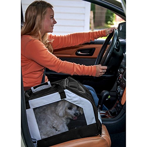 The Pet Gear Car Seat/Carrier easily attaches with the car seat belt to keep your carrier secure in the seat and your pet safe. The carrier has carry handles to facilitate transportation, top and front zippered doors for easy accessibility, fleece pad, interior tether, and rear pouches for small storage.