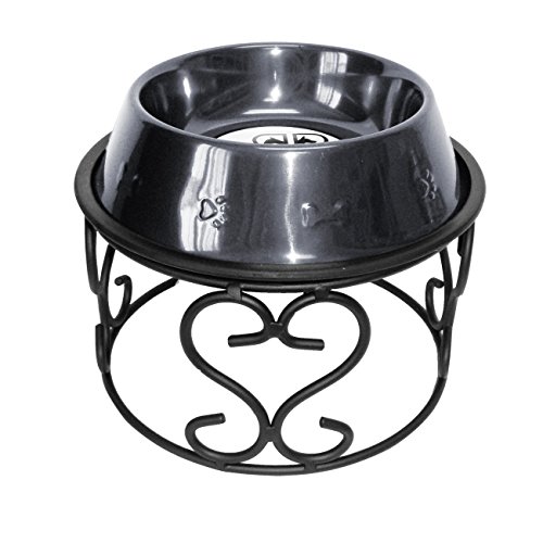 The Platinum Pets Wrought Iron Scroll Single Feeder features an elegant scroll design perfect for accentuating your modern home or your pet’s feeding decor. The stand is hand welded to feature scroll architecture throughout the stand and finished in a matte black powder coat for extra strength and durability. Each Scroll Feeder comes with one stainless steel Embossed Non-Tip Bowl powder coated in a variety of FDA approved finishes. The bowl is built to fit snugly into the feeder while being easily removable for dishwashing. Raised feeding promotes healthy digestion by limiting the amount of air that pets intake while feeding, thus reducing bloat and gassiness.