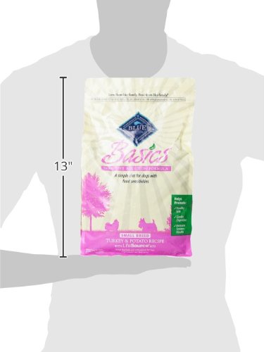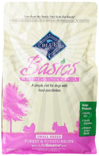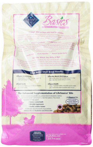 Blue Buffalo Small Breed Basics Limited Ingredient Formula Turkey & Potato Adult Dry Dog Food Getting back to basics is good advice for pet parents whose dogs show signs of being sensitive to some of the ingredients used in traditional pet foods. For these dogs, a careful selection of high-quality, natural ingredients is most important, and that’s the way our animal nutritionists have formulated Blue Buffalo Basics is a healthy and holistic limited-ingredient diet formulated to minimize food sensitivities while maximizing the nutritional value that your dog will receive. Turkey, a high-quality protein not commonly used in dog food, is the first ingredient, followed by three easily-digestible and mild carbohydrate sources potatoes, rice & oatmeal. We’ve increased the nutritional value of Blue Buffalo Basics by adding a precise blend of veggies, fruit and micro-nutrients, which also helps in the digestive process. And, like every one of our Blue Buffalo dog foods, Blue Buffalo Basics has no chicken or poultry by-product meals and no artificial ingredients of any kind. For small breed dogs with food sensitivities, the ingredients they don’t eat are just as important as the ones they do. That’s why Blue Buffalo Basics does not contain any corn, wheat, dairy, soy or eggs while still providing a simply delicious and nutritious meal that your food-sensitive dog will thrive on. The nutritional benefits of Blue Buffalo Basics are further enhanced by the addition of our exclusive LifeSource Bits. A precise blend of antioxidants, vitamins and minerals selected by holistic veterinarians and animal nutritionists, LifeSource Bits include ingredients that have been shown to help strengthen your dog’s immune system while supporting his life stage requirements.