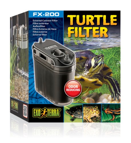The Exo Terra Turtle Filter FX-200 provides an odor reducing filtering system for turtle tanks, paludariums or aquatic terrariums. Comes complete with spray bar system for better aeration and all necessary filtration media. The dual chamber design allows for the greatest flexibility in servicing mechanical, chemical and adsorptive filtration media. Flow rates have been precisely calculated to provide the exact balance needed between mechanical filtration, water circulation and oxygen enrichment, resulting in optimum conditions for successful turtle keeping. The Exo Terra Turtle Filter includes the following filtration media: 1 fine foam, 2 coarse foam, 1 odor reducing pad and dual carbon pads. The odor reducing pad in combination with the dual carbon pads ensures maximum ammonia absorbing capabilities, beneficial in turtle tanks, paludariums or aquatic terrariums with high biological load.