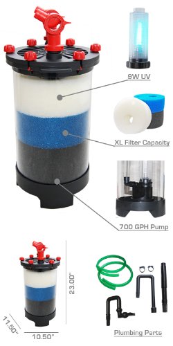 This is an all-in-one external canister filter for any freshwater or marine aquarium. This item includes all the parts, media, and accessories you need right out of the box. No extra parts needed. The included uv 9w sterilizer removes algae and harmful organisms. The powerful and strategically placed pump allows for super silent operation unlike conventional top mounted pump. Flow rate is 700gph and will work with up to 125 gallon aquariums.