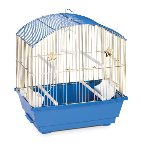 Prevue Pet Products Round Roof Parakeet Cage in Brass & Blue 1404 is designed to provide a spacious home for your small bird. Featuring decorative detailing on the front of the cage plus a bright blue and brass color combination, our Round Roof Parakeet Cage leaves lots of room for your bird to fly and play. Two plastic cups, four perches and one swing are included while a pull out tray allows for easy cleaning. Perfect for Parakeets, Finches, Canaries and Lovebirds, our cage measures 16-Inch long, 10-Inch wide and 20-Inch high with 1/2-Inch wire spacing.
