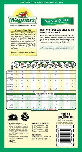 Wagner’s Classic Wild Bird Food is blended for year round feeding and is formulated to attract a wide variety of birds. This blend of sunflower seed, millet, cracked corn, and milo will attract your favorite birds year round – in the winter when natural seeds are scarce, spring and summer for hatchlings, and autumn to give energy to the migrating birds. Wagner’s Classic Wild Bird Food is a great value and you are sure to keep them coming to your backyard for more. Trust your backyard birds to the experts at Wagner’s.