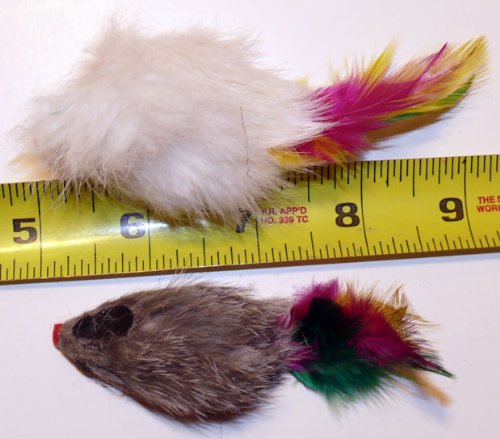 The mice come sealed in plastic from the factory, each with colorful feathers for a tail, felt nose, ears, eyes and measures approximately 4 to 4.5 inches long from tail tip to nose tip. Don’t forget that these mice Rattle, unlike many of the other mice found on Amazon.Cats just LOVE fur, feathers and sound while they play.