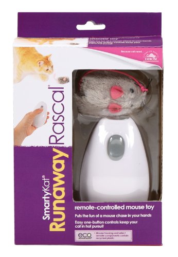 Satisfy your cat’s need for Exercise. The RunawayRascal remote-controlled mouse toy puts the fun of a mouse chase in your hands. Cats can’t resist the erratic movements you create with the ergonomic one-button remote. And you’ll have almost as much fun watching the chase. EcoAdvantages: Mouse housing and select remote components contain recycled plastic