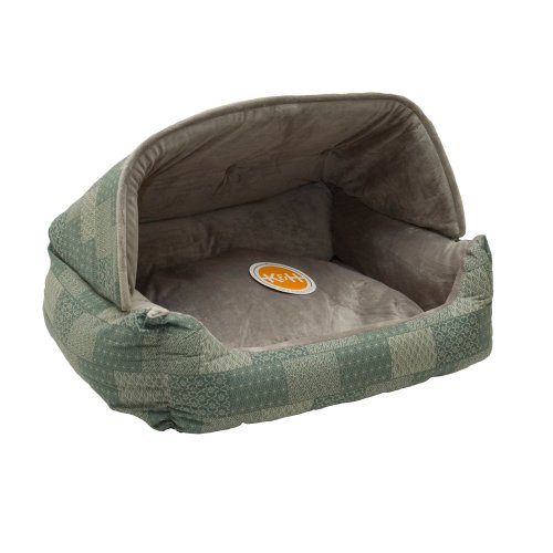 This snuggle bed offers pet privacy and a secure place to cuddle up. The hood can be removed and converted to a lounge sleeper. The pillow is removable and has a zipper for easy machine washing. The pillow inside is made from microfleece while the outside bolster and hood is made from attractive and durable poly/cotton. The bed is filled with premium polyfil made from recycled plastic bottles. Available in 1 size and 2 patchwork prints.
