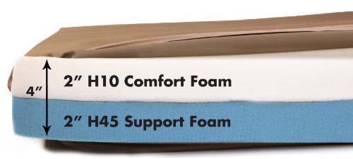 – Our crate mats use 2 different layers of foam. The top 2″ is H10 Comfort Foam, which molds gently around your dog’s pressure points. The bottom 2″ is H45 Support Foam, which provides orthopedic support and prevents your dog’s joints from coming into contact with the hard plastic and metal.