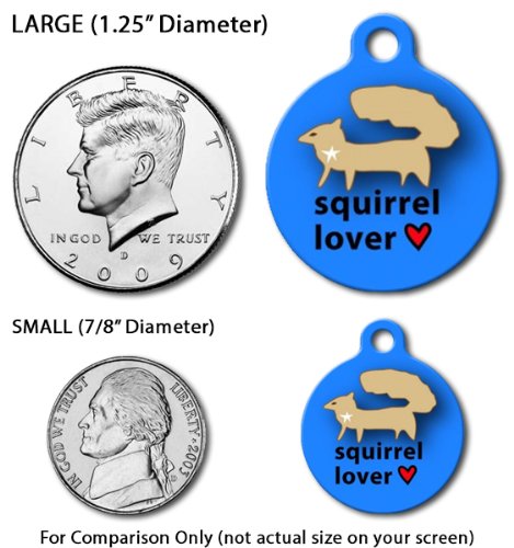 Our dog tags come in two sizes: Large (1.25″ diameter – about the size of a half dollar) and Small (7/8″ diameter – about the size of a nickel). The small tag is best for cats and little dogs while the large size is more suitable for medium and large dogs.