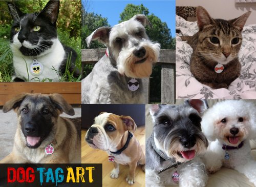 Dog Tag Art pet tags are made of high-quality recycled stainless steel and are each permanently infused with full-color graphics and personalized text. They are fully customizable with pet name, phone number, and other vital information. Our dog tags for pets are one-of-a-kind, extremely durable, and of the highest quality.
