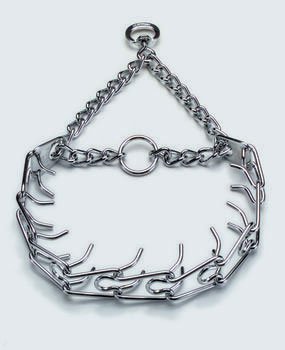 Herm Sprenger Dog Collar The Herm Sprenger prong collar is one of the most recognizable and popular names in obedience training tools. A safe and effective alternative to choker collars, it puts even pressure around the neck, about every half inch, pinching the skin in a band. This collar does not apply direct pressure to the trachea so you can train your dog with little or no tugging, jerking, or pulling. Made of high quality German steel and adjustable size, just add or remove the chrome plated links individually. Features: -Interlocking links, each link equipped with two blunt prongs -Slips over dog’s head for easy on, easy off -Slightly beveled, polished prong tips -Easy to increase or decrease size -Made in Germany Sizes: 14″L X ¾”W (2.25mm) 18″L X 1″W (3mm) 20″L X 1″W (3.25mm) 22″L X 1 ¼”W (3.8mm) Sizing instructions: Collar should fit snuggly just below the dog’s ears, measure the circumference of dog’s neck and add 2″w