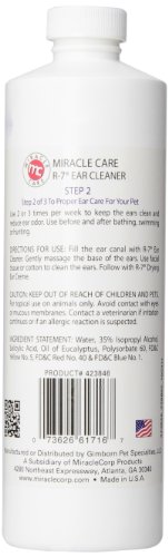 R-7 Ear Cleaner by Miracle Care is a safe and effective for both dogs and cats. Use R-7 Ear Cleaner as a grooming aid at least once a week to help keep the ears clean and reduce odor. Apply freely to the ear before or after bathing or swimming. Removes ear wax.