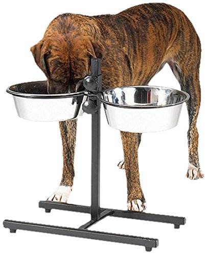 This adjustable diner is raised dog diners that allow dogs to eat in a more elevated, comfortable position. Diners have two bowls that are dishwasher safe for easy cleaning. These raised height diners help to promote good digestion. Eating in a natural standing position improves a dogs body alignment and aids in digestion. Adjustable diners feature a wide h-style base. Bowls adjust easily with the twist of a knob. Made of stainless steel. Available in black color. Diners with two 5-quart bowls measures 23-1/2-inch length by 10-3/4-inch width by 22-inch height.