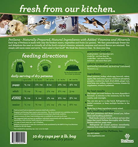 PetSana’s unique blend of real, fresh ingredients combines premium beef or turkey with a wide variety of nutritious whole foods such as sweet potatoes, cranberries, papaya and carrots. Each of our selections is prepared by freeze-drying and dehydrating our ingredients rather than processing them at high temperatures, the way dry kibble is made. Both varieties of PetSana are completely grain free, preservative free and free of fillers. Our unique preparation keeps all of the vitamins, enzymes and natural flavors intact for a delicious “home-made” complete meal. Just add warm water and serve.