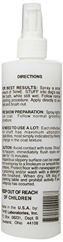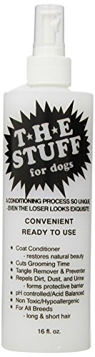 Grooming Tip: Mix 1 ounce of the Stuff with 1 quart of water. Pour mixture over dog after shampooing and before toweling. The undercoat comes out easily and the product will penetrate tangles better than spraying. This is a ready to use. The Stuff Conditioner and Detangler is a unique leave-in hair conditioner and dematting formula that’s hypoallergenic and non-toxic. Conditions and protects a pet?s coat while removing and preventing tangles. Penetrates mats and tangles to cut grooming time Formulated with Silicon to repel dirt, dust, and urine so coats stay cleaner longer Great to use on all coat types This 16 oz bottle of The Stuff Conditioner and Detangler contains a ready-to-use formula.