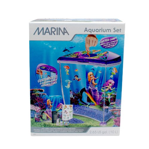 Fun and imaginative, this marina aquarium set includes everything you need to set up an adorable mermaid theme tank. the set comes with cling-on mermaid decals and a flexible cut-out background that features a cast of mermaids. it also comes with a plastic cut-out ornament for additional decoration. after you have set the mermaid scene with the decals, background and ornament, the rest is also pretty easy. simply install the filter and place the gravel at the bottom of the tank. then add water and doses of nutrafin water conditioners (included). the aquarium has an innovative canopy (aquarium lid) that makes feeding your fish with nutrafin max fish food (included) convenient. there is an opening at the top that allows you to sprinkle the food in the water without having to remove the lid. this turns feeding into a mess-free operation.