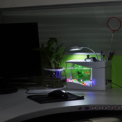 3>Come with decorative pebbles, an artificial plant, and a USB connector. Overhead LED light and multicolor LED interior lights under water.
