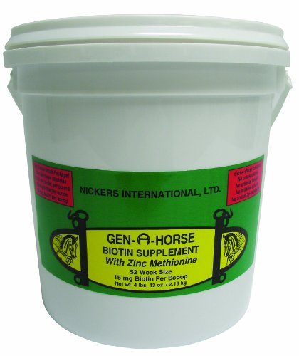 D-Biotin, Ground Wheat Middling s, Zinc Methionine. “Biotin supplement that strengthens and improves new hoof growth, allowing horses to hold their shoes full term.” Gen-a-horse is the most concentrated biotin supplement on the market. Formerly gen-a-hoof. Gen-a-horse is naturally palatable and easy to feed. “Contains no artificial flavors, colors, additives or animal by-products.” 52 week supply.