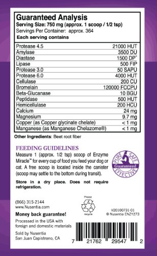 Hugely beneficial for supporting dogs battling yeast, candida, and gas associated with poor digestion. ***Enzyme Miracle® is 100% vegetarian and does not contain any animal based materials. While pancreatic enzymes may work well for some, Nusentia believes that vegetarian enzymes work best with the least amount of side effects. Pancreatic enzymes do not go to work right away and can cause numerous side effects in dogs.