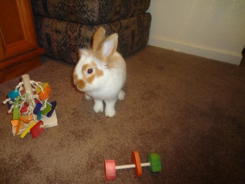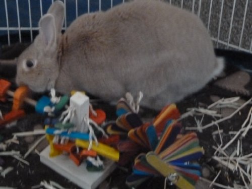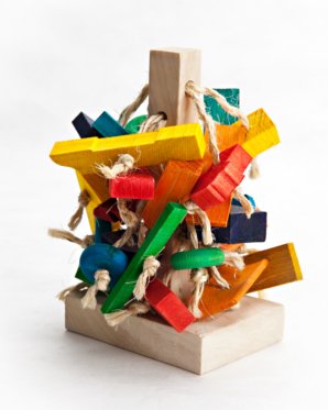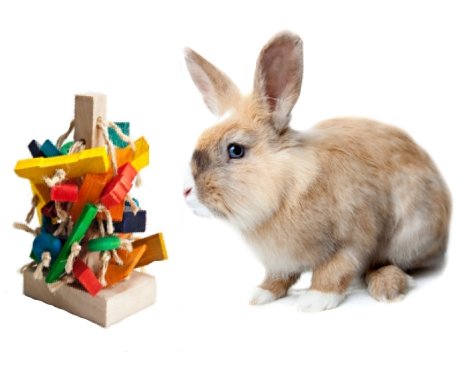 This free standing rabbit toy is perfect for the bunny that always has free range! No wires or hangers needed. Also works well in the rabbits enclosure. All the small toy pieces and sisal are very chewable for your rabbit!